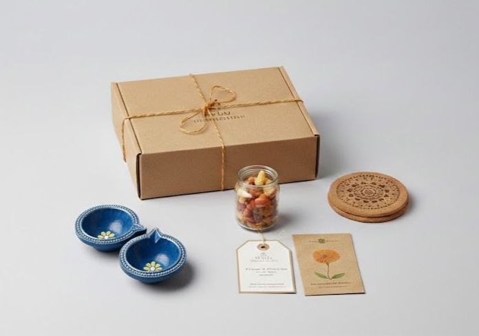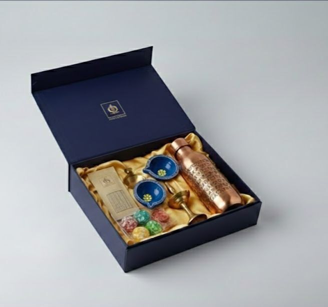 The Gift includes - a premium magentic box with branding, 2 Diyas, traditional, small incense holder, pack of small incenses, small pack of Indian sweets, a 500 ml copper bottle